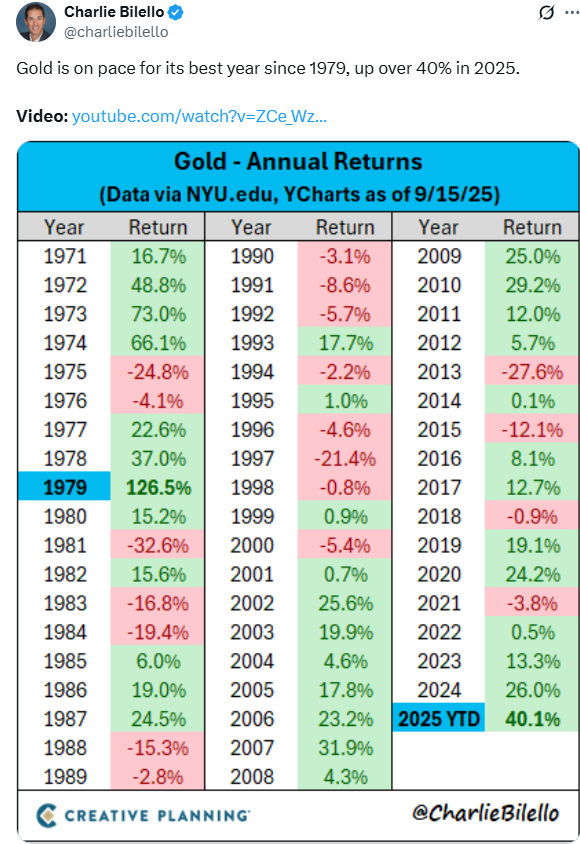 As analyst Charlie Bilello pointed out, if it keeps this pace… it’ll be the best year for gold since 1979. Take a look: